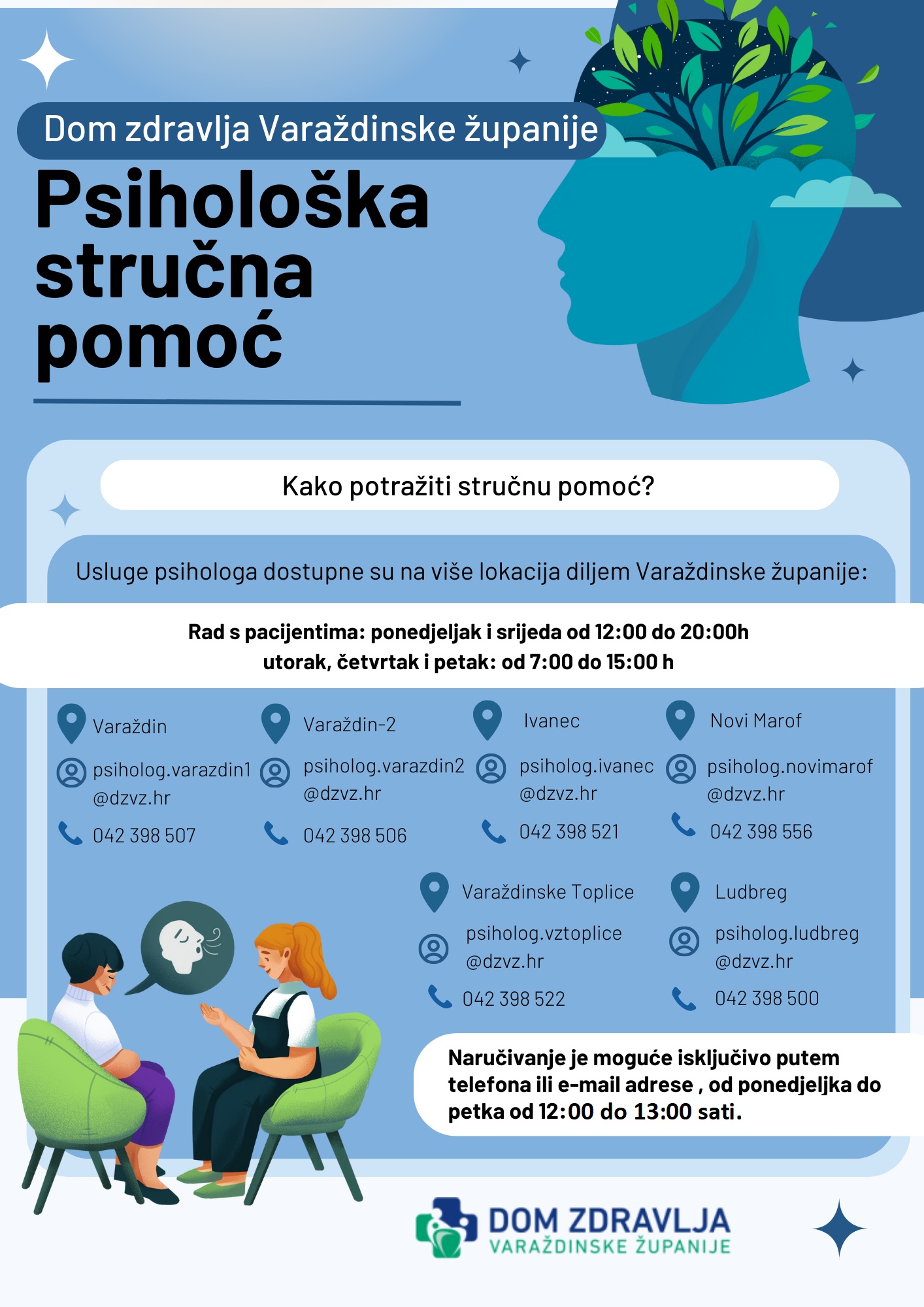 U Domu zdravlja Varaždinske županije brinemo o vašem mentalnom zdravlju. Znamo da život donosi razne izazove – od školskih briga i problema u obitelji, do stresa na poslu ili osjećaja usamljenosti. Zato smo tu za vas, bez obzira na Vašu dob.