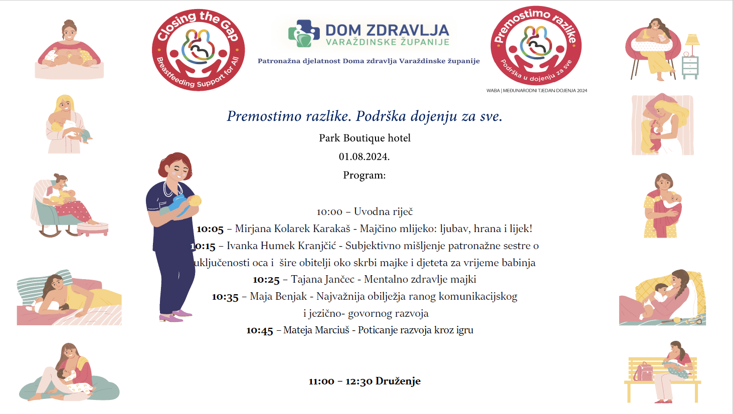 Patronažna služba Doma zdravlja Varaždinske županije poziva sve majke i roditelje na obilježavanje Međunarodnog tjedna dojenja 01. - 07. kolovoza, koji će se održati 01. kolovoza 2024. godine u Park boutique hotelu, J. Habdelića 6, 42000 Varaždin s početkom u 10,00 sati.