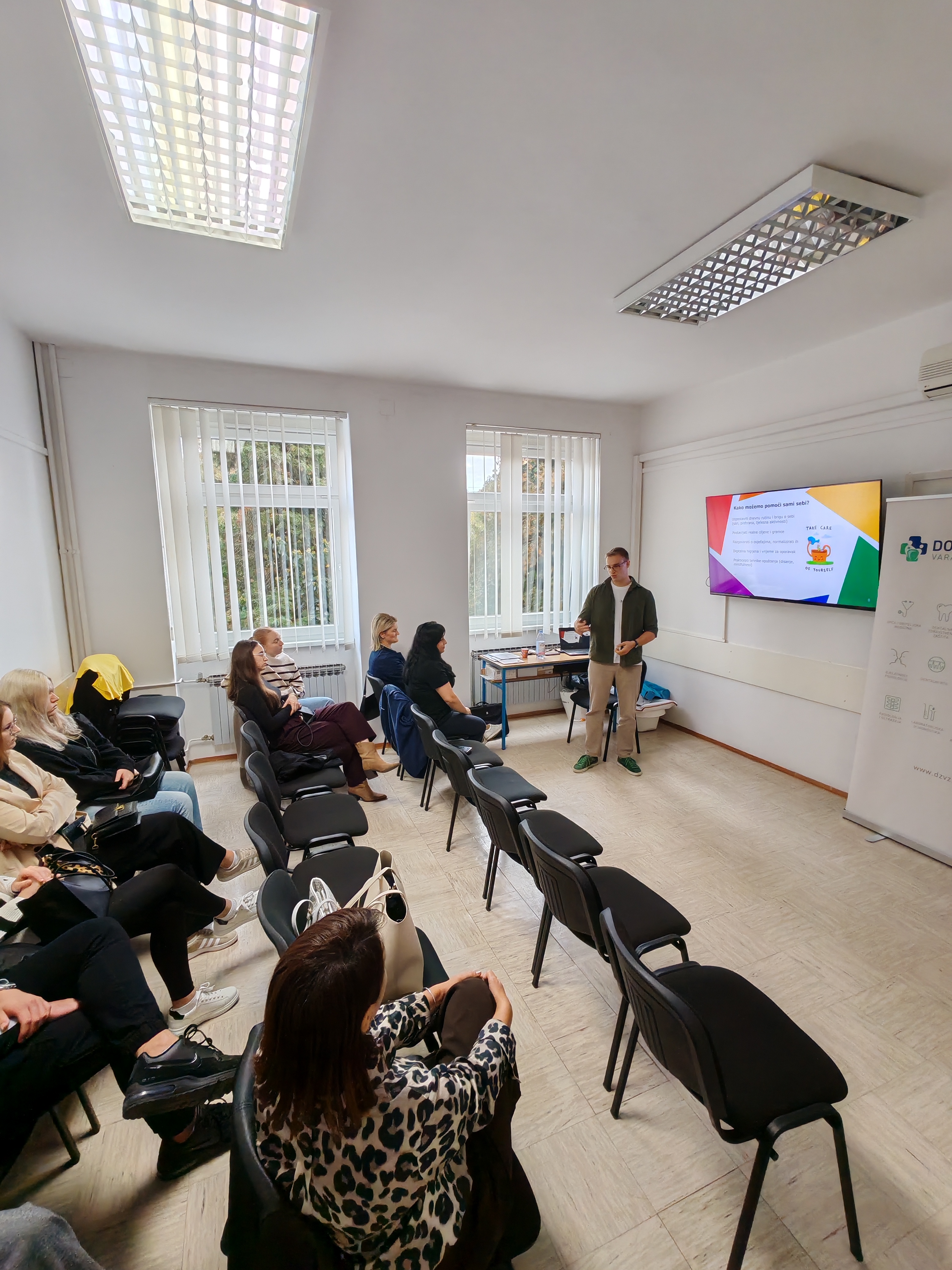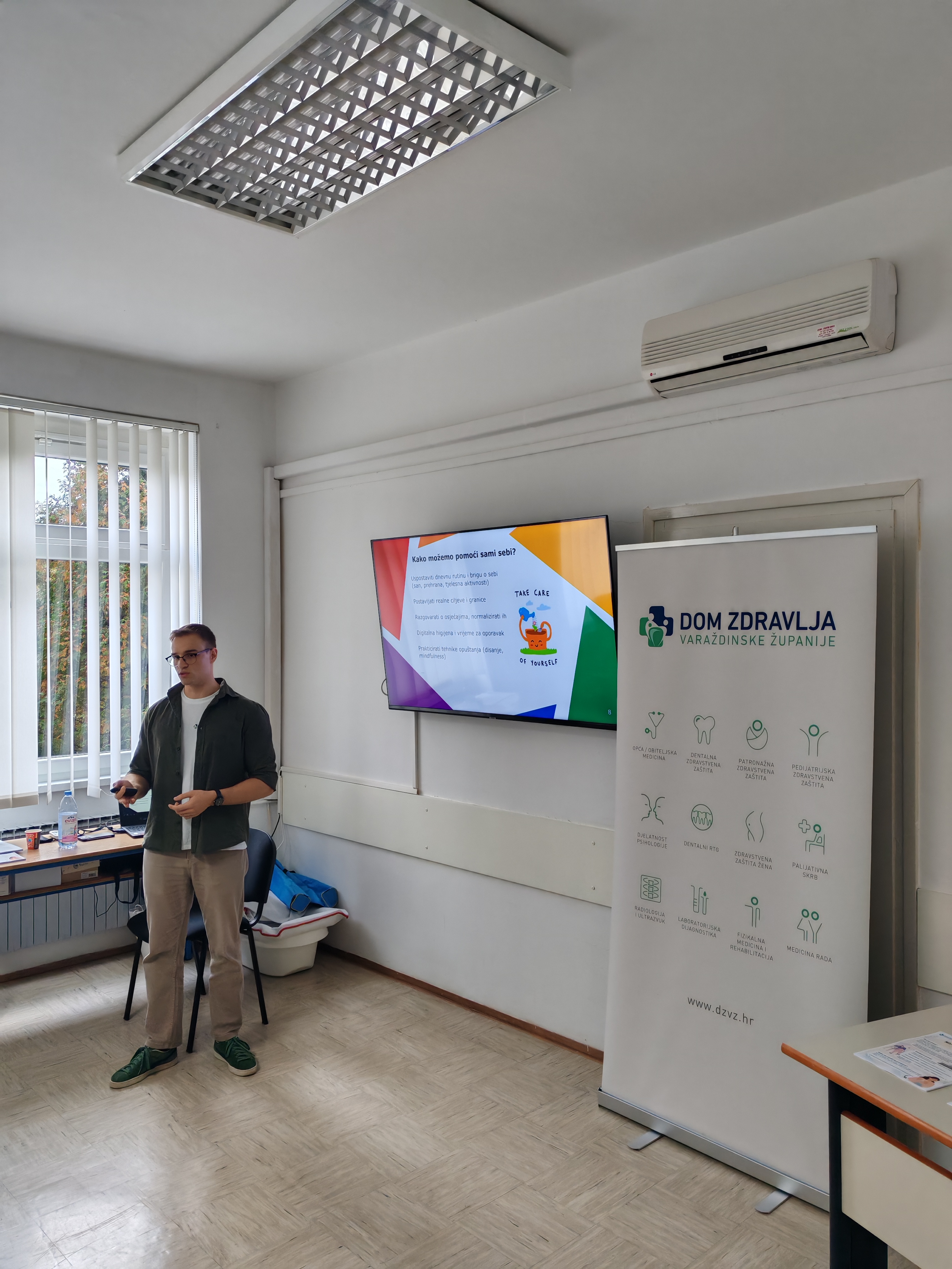 Psiholozi Doma zdravlja Varaždinske županije Kevin Kutnjak i Matej Fiškuš održali su danas radionice za učenike i studente o tome kako očuvati mentalno zdravlje. Kroz interaktivno predavanje naglasili su važnost zadovoljavanja osnovnih životnih potreba, s osvrtom na ključne rizične faktore koji mogu narušiti mentalno zdravlje te poučili nazočne o tehnikama za samopomoć s ciljem jačanja zaštitnih faktora. U slučaju da osoba nije u mogućnost samostalno se suočiti sa životnim izazovima i stresom, psiholozi su ponudili pomoć u vidu psihološkog savjetovanja pri Domu zdravlja Varaždinske županije.